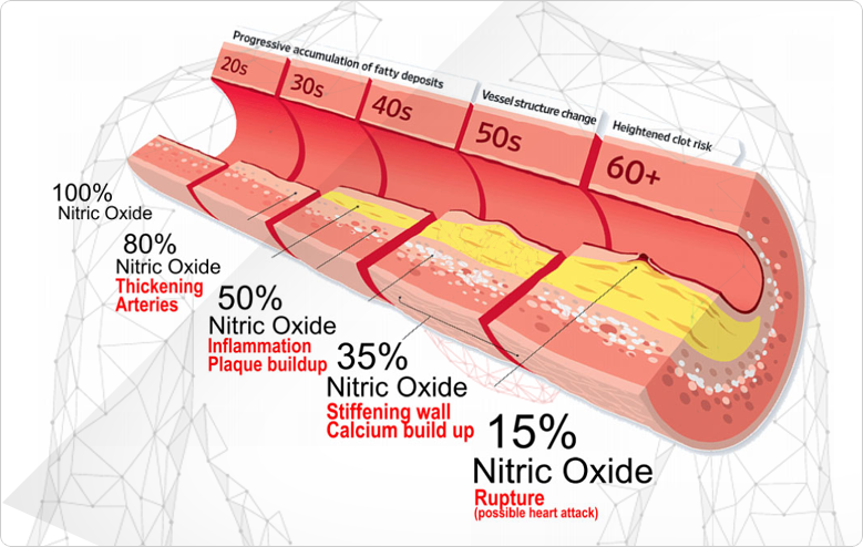 When Nitric Oxide levels diminish blood flow slows down. Your oxygen deprived blood starves your organs and other tissues of nutrients they need to remain healthy.